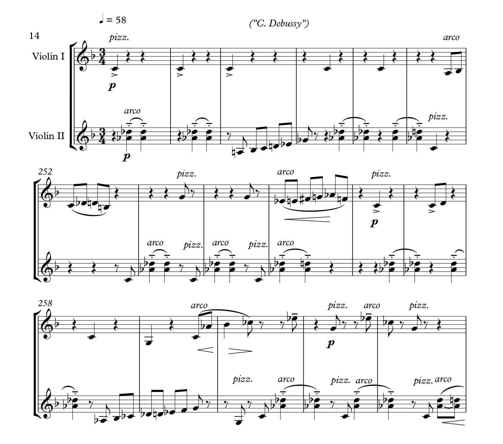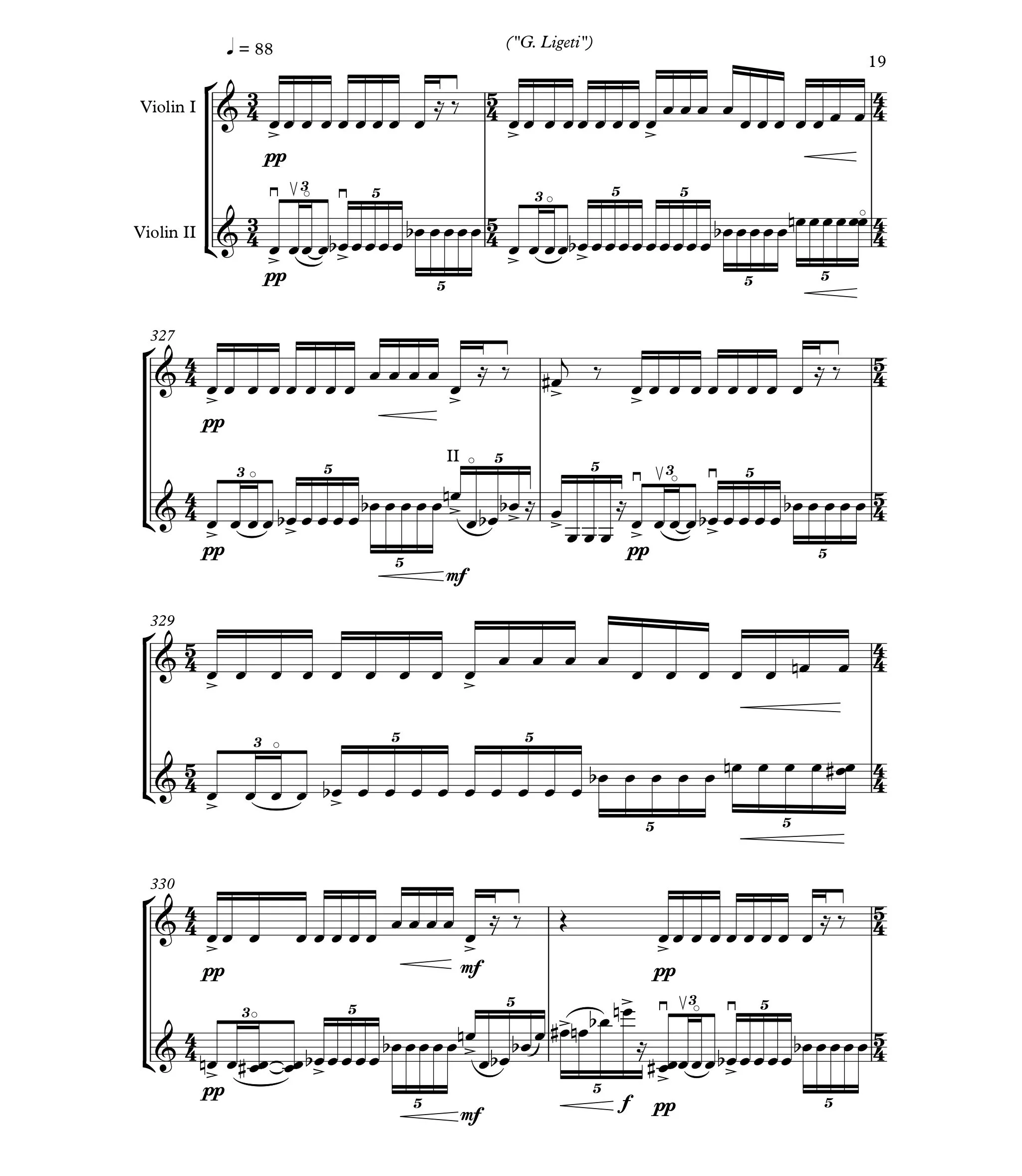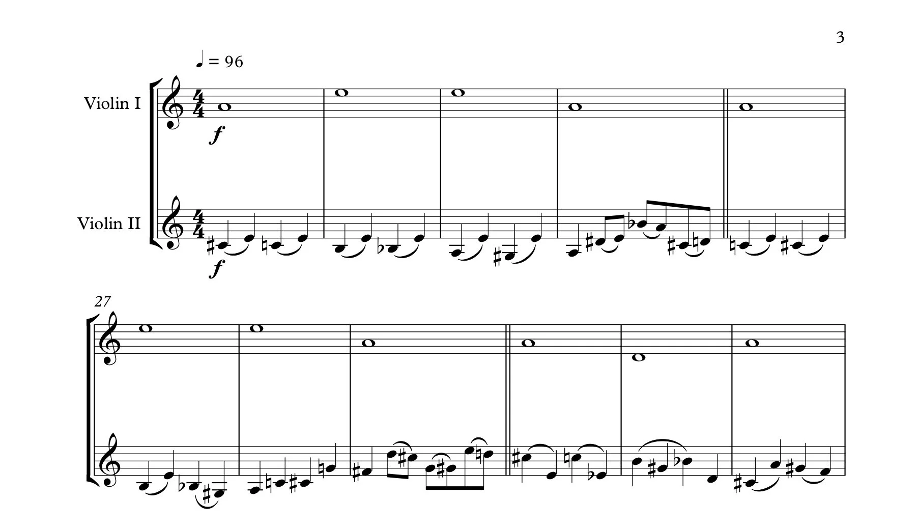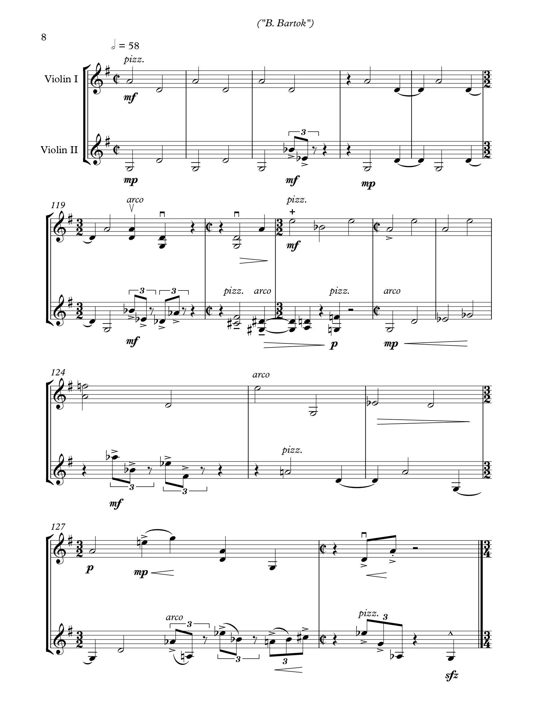 Inspired by the great contributions to string chamber music repertoire by Bartók and Berio, as well as the former’s Mikrokosmos and Kurtág’s Jatekok in the pedagogical vein, Jeffrey Niederhoffer began writing his Progressive Duos for two violins in 2019, and continues to add to the project regularly. In the spirit of these great works, many of the Duos are written as homages to composers of the past, and range from simple, open string melodies, to more traditional virtuosic challenges, to modern extended playing techniques. Intended to be played by student and teacher together, the Duos aim to present an interesting and entertaining introduction to new music.
