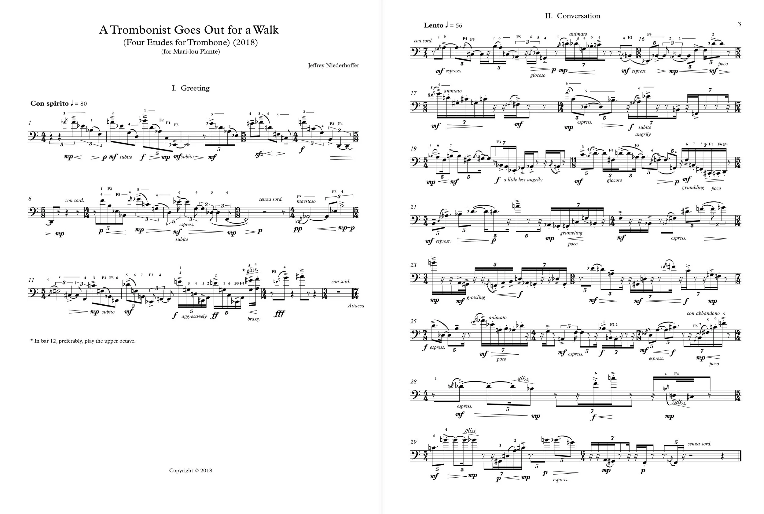 A Trombonist Goes Out For A Walk is a set of four etudes for solo trombone. The trombonist greets others (Greeting, Etude 1); converses with another, somewhat contrary, trombonist (Conversation, Etude 2); reflects upon that odd encounter (Reflection, Etude 3); and then returns home, sprinting and sliding along the way (Sprint and Slide, Etude 4). The first etude, marked Con spirito, essentially consists of music descending by leaps. The second etude, Lento, alternates lyrical and aggressive, staccato music. The third etude, Teneramente, features long, lyrical lines often involving large leaps. The fourth etude, marked Con moto, ma un po’ disorientato, is a mad dash for home featuring descending and ascending chromatic lines, interspersed with abrupt, syncopated glissandi. This etude ends as it began with a brief return to the opening music, but replacing the minor third glissando with a major third glissando.