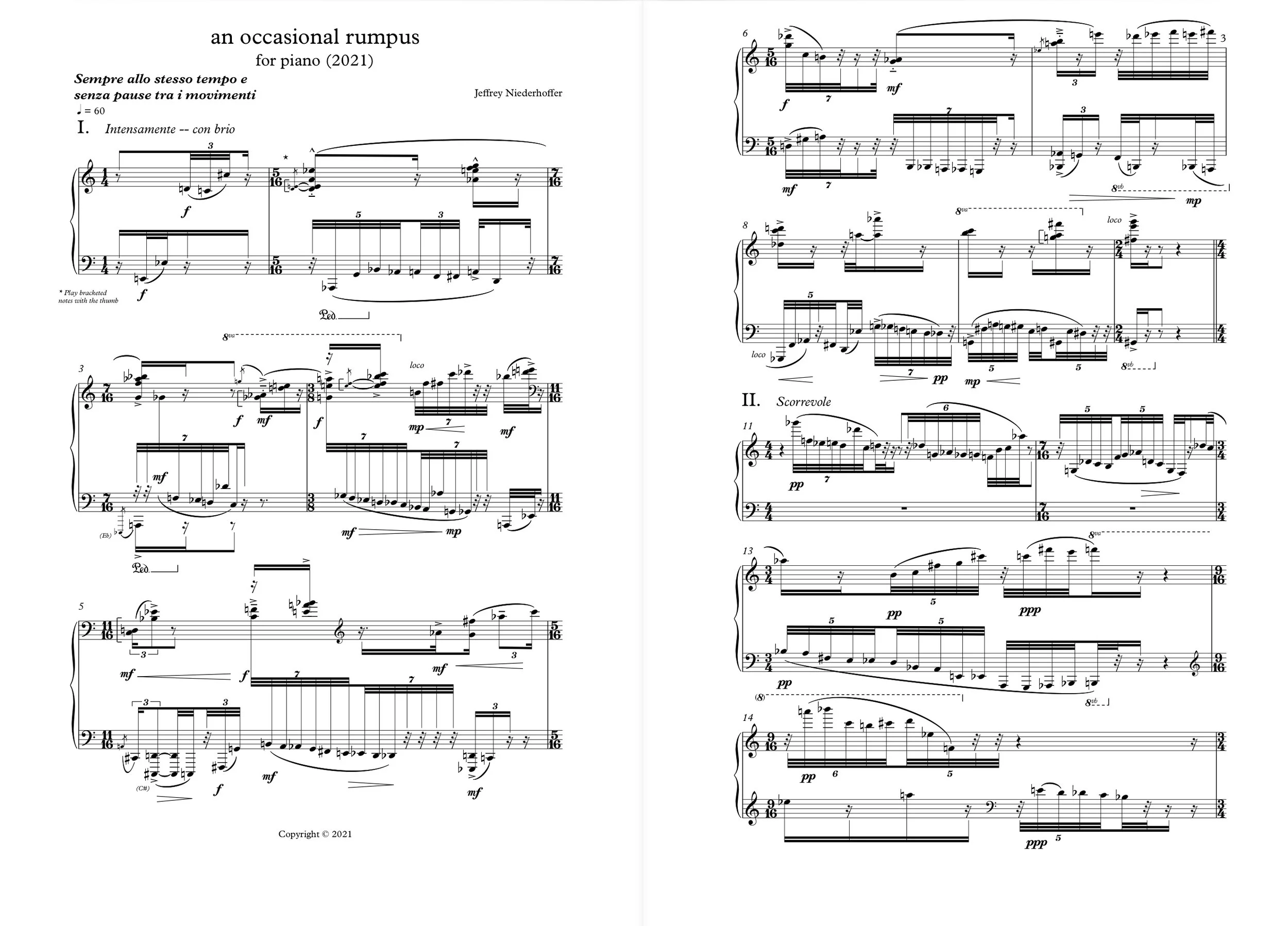 an occasional rumpus, my second extended work for piano and my first completed piece in 2021, is part of series of works exploring the chromatic scale; it is, in a sense, a meditation on, and an exploration of, the chromatic scale as a motif. Written in 19 short sections, though not planned that way, and lasting just over six minutes, the work intermixes extended passages of quiet, introspective music and loud, brash music; hence, the title — an occasional rumpus — that is, an occasional commotion. The work contains no quotes, but the piece was written with a number of composers in mind: Bach (the brilliant harmonically-constrained counterpoint); Beethoven (the late Piano sonatas), Brahms (the late piano music), Chopin (especially the Fourth Ballade), Liszt (the piano music generally) and Boulez (particularly the Second Sonata and Incises).